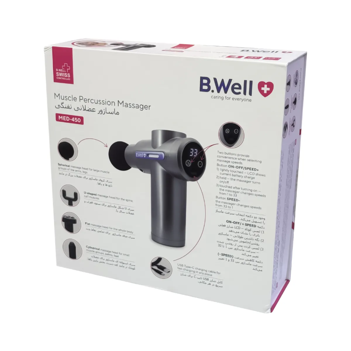 یک ماساژور ضربه‌ای حرفه‌ای است که استانداردهای ایمنی سوئیس، شدت قابل تنظیم و لوازم جانبی متنوع را برای تسکین هدفمند ترکیب می‌کند. قابلیت حمل و نقل و قابلیت‌های بافت عمیق آن، آن را برای ورزشکاران، مبتلایان به درد مزمن یا کاربران روزمره که به دنبال بازیابی عضلات هستند، ایده‌ آل می‌ کند. ماساژور برقی تفنگی بی ول MED450 دارای مزایای زیر است: بازیابی عضلات: تسکین تنش، اسپاسم و درد پس از تمرین بهبود گردش خون: افزایش جریان خون و کاهش سفتی چند کاره بودن: تمام نواحی بدن را پوشش می‌ دهد – از گروه‌ های عضلانی بزرگ (پشت، ران) گرفته تا مناطق کوچک (کف دست، 25 فوت) قابلیت حمل: طراحی جمع و جور، ایده‌آل برای سفر، باشگاه یا استفاده در منزل و محل کار